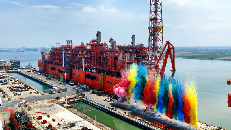 我國自主建造的最大噸位、最大儲氣量的新型海上浮式液化天然氣生產裝置NGUYA FLNG(恩古雅海上浮式液化天然氣裝置)在江蘇南通(啟東)呂四港啟航,巨力索具5000T吊梁大展風采。
