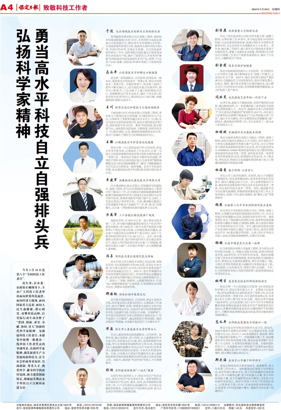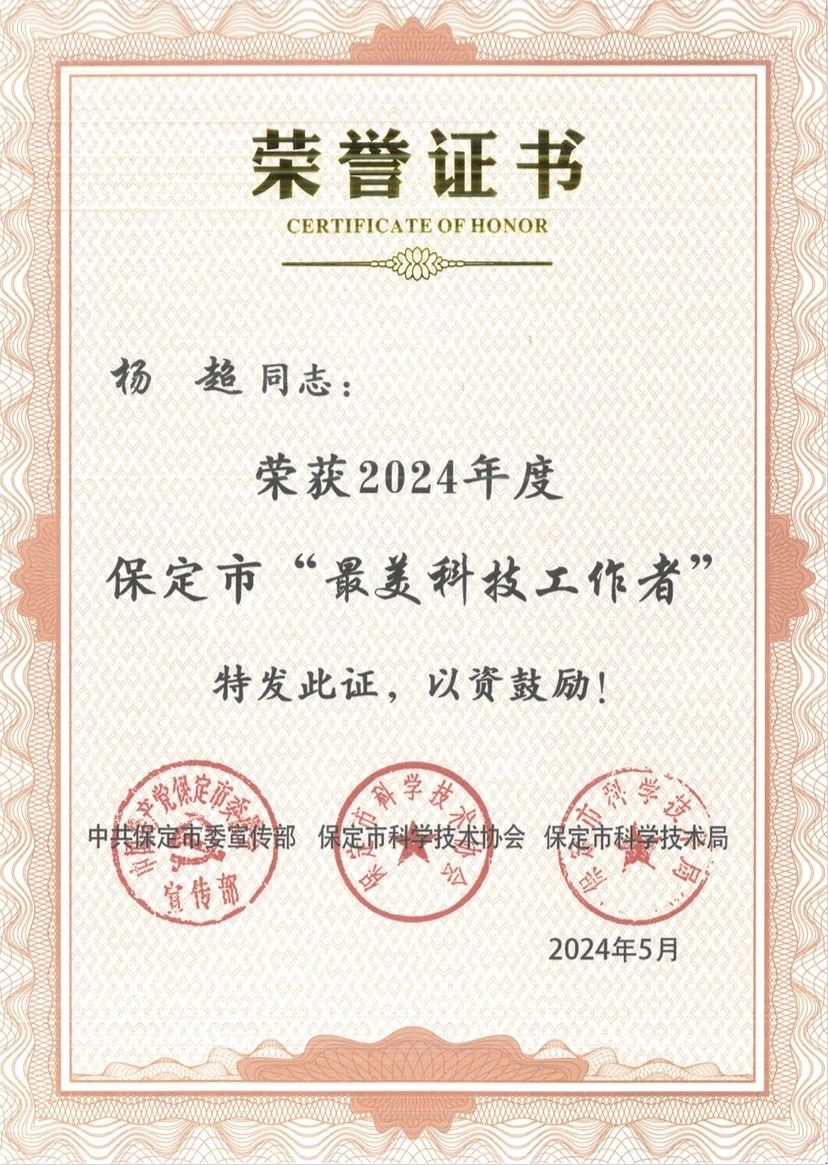 近日,保定市市委宣傳部、市科學技術協會、市科技局聯合開展了2024年保定市“全國科技工作者日”評選活動,經組織推薦和評審專家委員會綜合評比、公示,巨力索具股份有限公司黨總支書記、總裁楊超榮獲“最美科技工作者”稱號。