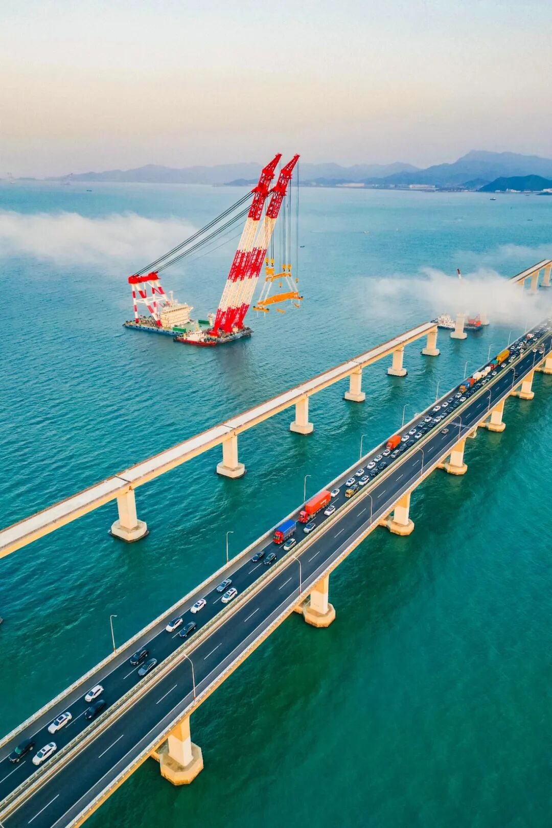 此次架設的鋼梁長107.5米,重約1779噸,加吊具總重2182噸,相當于1500輛家用轎車的重量,橋面至海面最大高度達53米(近20層樓高),鋼梁架設區域毗鄰既有象山港公路大橋,船舶站位緊鄰主航道,往來船只流量大,施工空間狹小、船舶通航密集,對吊裝精度與穩定性提出嚴苛要求。