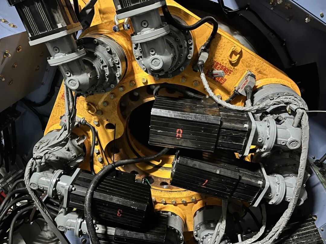 單葉片吊裝配套的盤(pán)車(chē)工裝采用創(chuàng)造性的8個(gè)電機(jī)驅(qū)動(dòng),優(yōu)秀的控制程序,均衡了驅(qū)動(dòng)的受力。機(jī)載控制面板和手持平板電腦均可查看和控制盤(pán)車(chē)使用過(guò)程。剎車(chē)裝置采用電機(jī)抱閘剎車(chē)和機(jī)械剎車(chē)雙重保障。