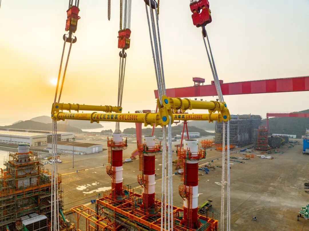 在裝置建造過程中,巨力索具承擔了該“海上移動化工廠”上部模塊的吊裝集成任務,為項目量身定制了5000T吊梁系統(tǒng)。這套裝備需承受FLNG模塊吊裝過程中的動態(tài)載荷,技術要求遠超常規(guī)海工項目,是項目建設中技術難度最高、風險最大的環(huán)節(jié)之一。