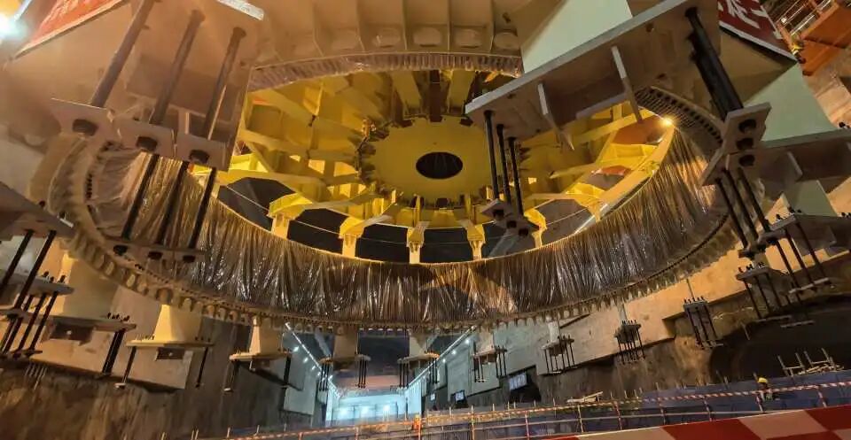 定子作為發(fā)電機組的重要核心部件,主要由機座、鐵芯和繞組三大部件組成。此次吊裝的定子外徑達16.4米,高5.6米,由22萬張0.5毫米厚的硅鋼片疊裝而成,總重量達544.3噸。
