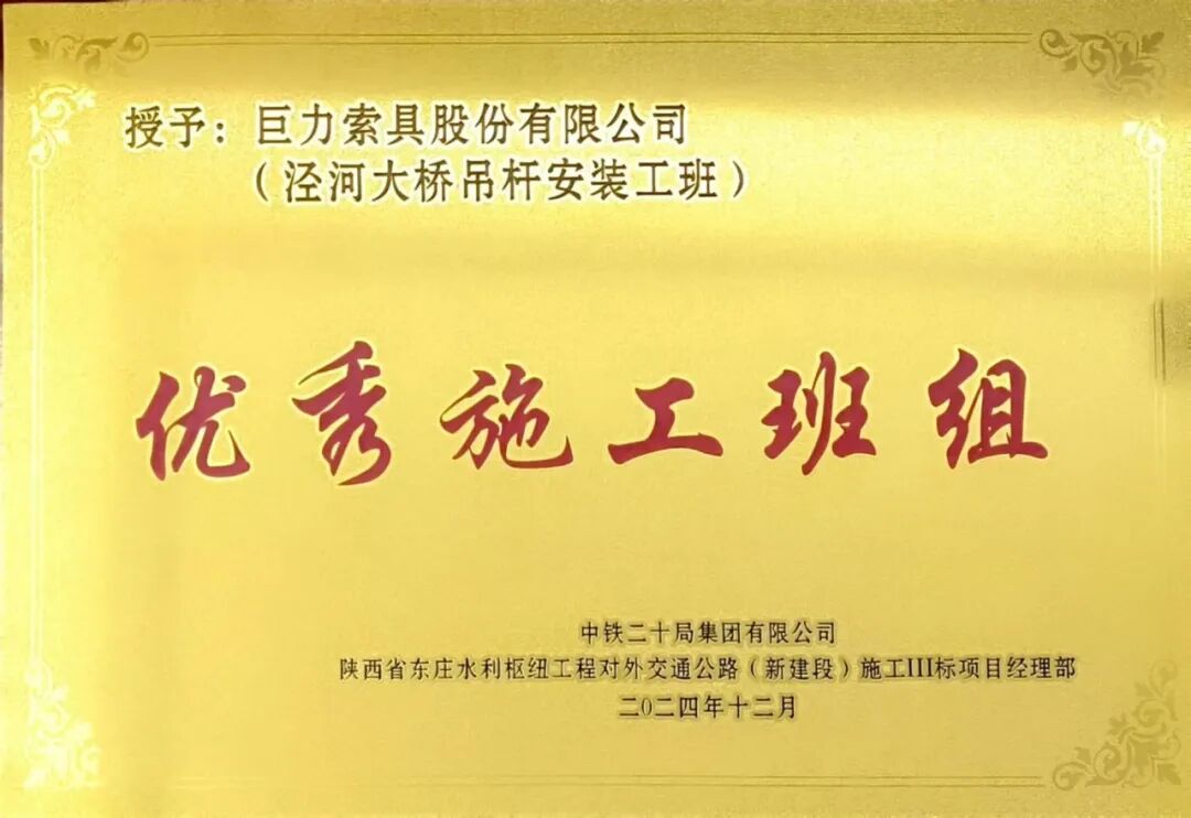 在吊索安裝環(huán)節(jié),巨力索具團(tuán)隊(duì)積極優(yōu)化作業(yè)流程,對(duì)吊索安裝張拉后的穩(wěn)定進(jìn)行觀測,確保安裝進(jìn)度與質(zhì)量,為大橋的順利通車提供了關(guān)鍵保障。巨力索具團(tuán)隊(duì)也因出色的現(xiàn)場表現(xiàn),被項(xiàng)目部授予“優(yōu)秀施工班組”的榮譽(yù)稱號(hào)。
