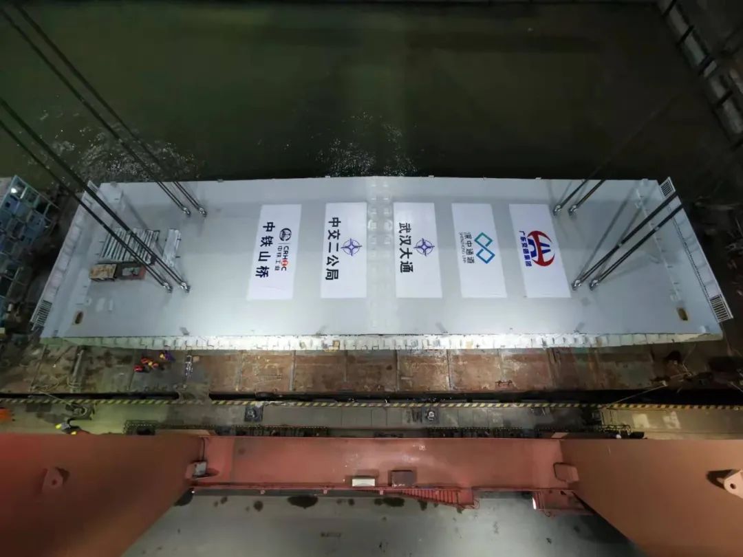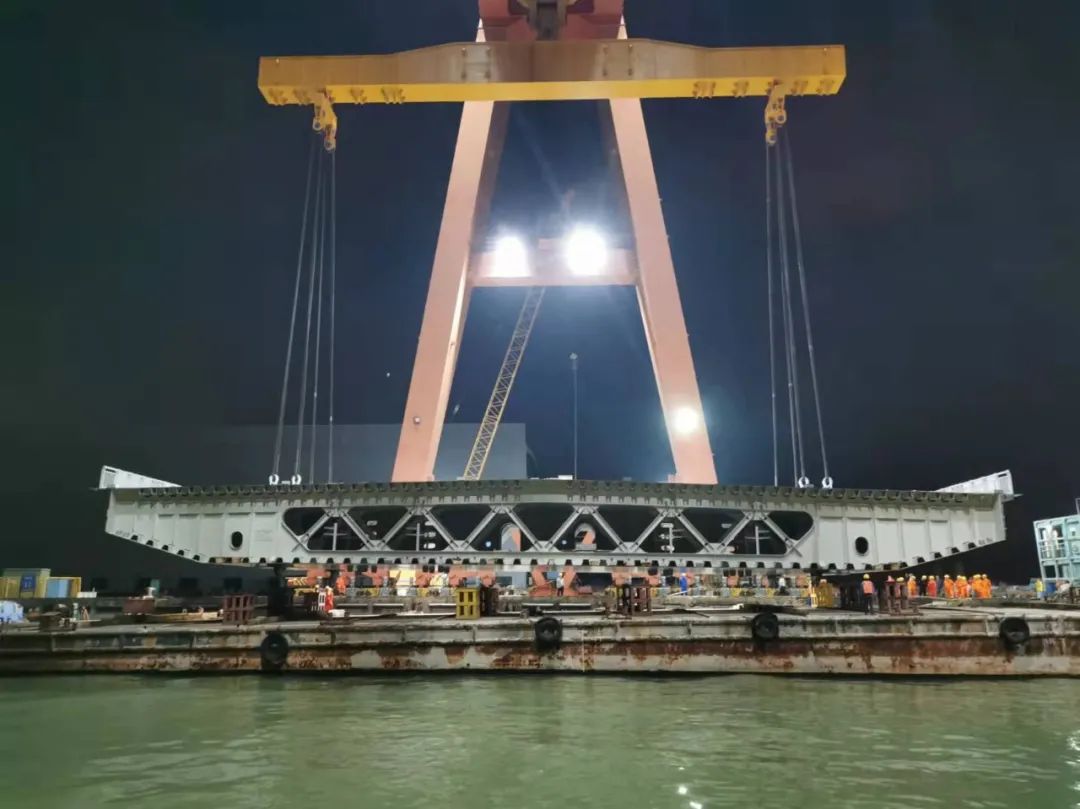 深中通道G05標段泄洪區及淺灘區鋼箱梁大節段XG9L的出海平臺方案為世界首創的出海運輸方案,整個運輸過程使用8臺模塊車,4臺移梁平車,頂升運載能力可達2000噸。經過三次頂升及運輸,將鋼箱梁大節段XG9L從存梁區運至待裝船區,由世界第二起重能力的“天一號”運架一體船將鋼箱梁吊運至橋址。