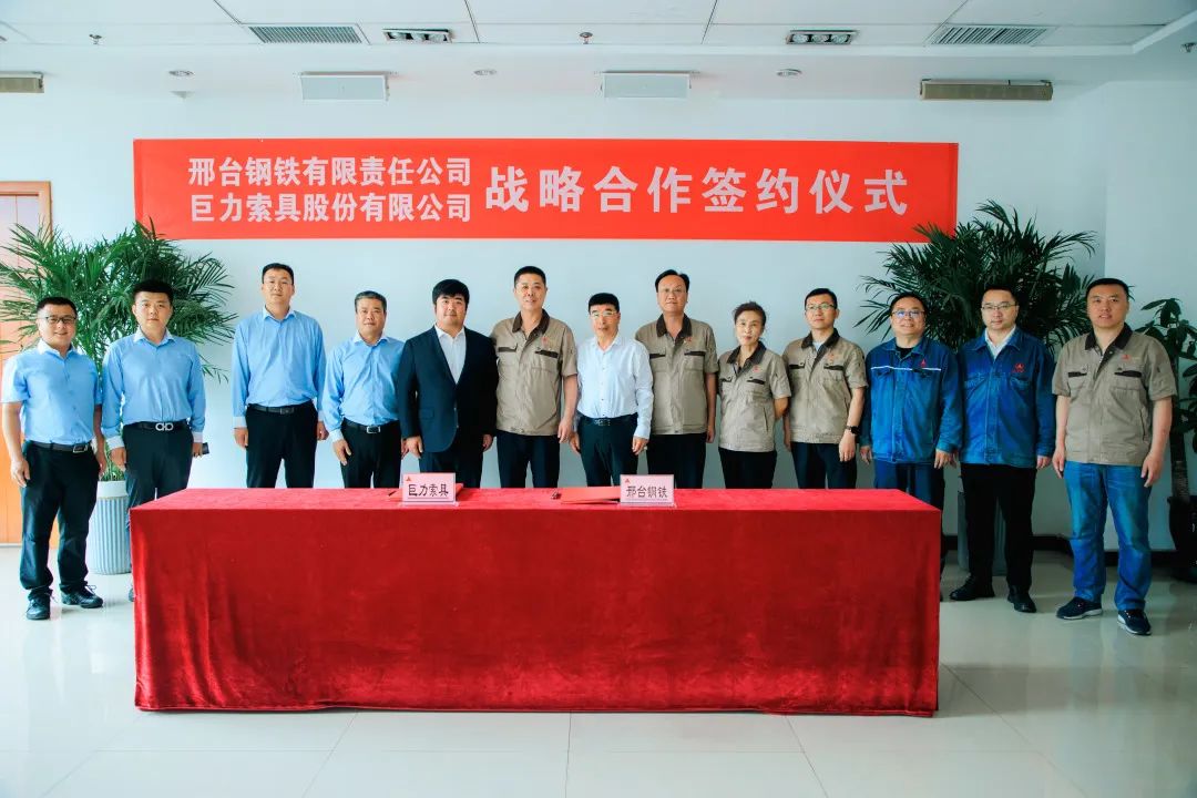2023年6月19日,巨力索具與邢臺(tái)鋼鐵簽訂戰(zhàn)略合作協(xié)議,邢臺(tái)鋼鐵董事長張育明,巨力索具董事長楊建國、總裁楊超出席簽約儀式,并就合作情況展開詳細(xì)座談。