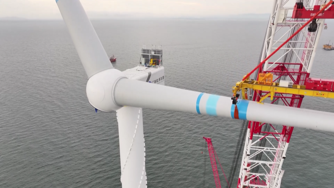 據(jù)悉,本次吊裝的風電機組單支葉片長111.5米、重42噸,葉輪掃風面積40627平方米。